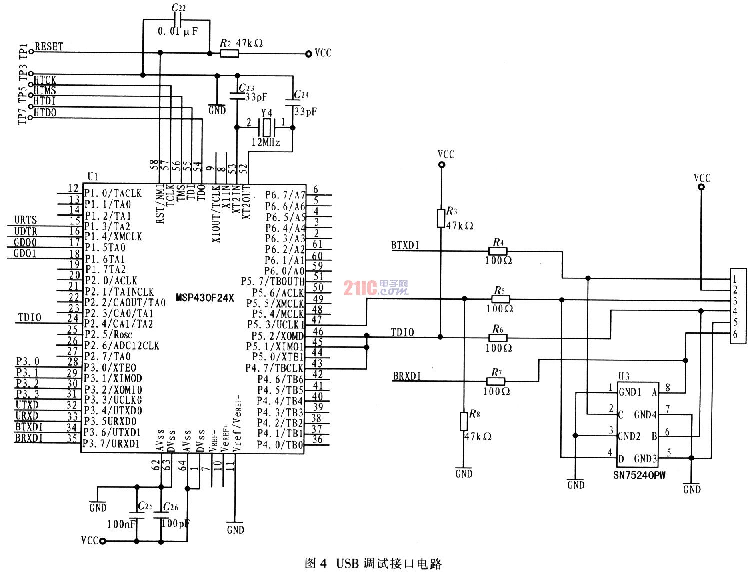 该系统开发工具通过MSP430的USB调试端口与PC机相连,通过开发平台在PC机上对其进行开发。LISB调试接口为该系统设计提供3.6 V的标准电压,其通过SBW接口相连接,可作为一个标准的Flash仿真工具,射频USB调试接口采用返回通道的MSP430 UART端口,这样在调试阶段可以独立应用,允许用户在无流量控制的条件下,以9 600 b/s固定速率将串行数据传输到终端窗口。USB调试接口电路如图4所示。