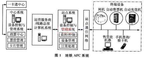 地铁AFC系统主要由中央计算机系统、站点计算机系统、终端设备和车票4部分组成。终端设备包括出/入站检票闸机、自动售票机、车站票务系统、自动充值机等现场设备,如图1所示。