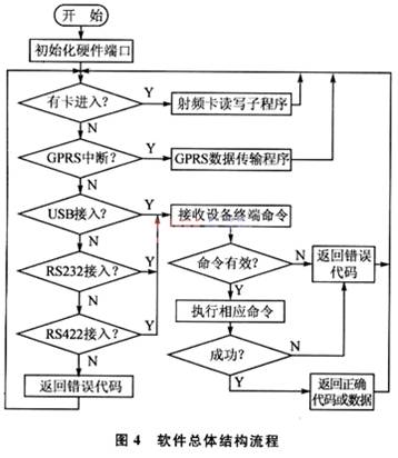 总体软件主要负责各个模块的控制,并协调各个模块之间的工作。在系统上电后,首先负责对系统各个硬件接口进行初始化,然后进入正常工作循环。在正常工作循环中,可以实时感应射频卡,对射频卡进行读写相关操作;GPRS采用串口中断方式响应远程监控主机,向远程监控主机发送设备信息;而与现场设备终端通信的方式可以有USB、RS232和RS422方式。这3种方式优先采用USB方式,然后采用RS232或RS422方式,很好地处理了多接口之间的协同问题。