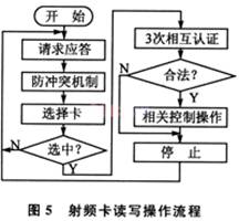 微处理器通过对MF RC531相关寄存器的控制实现对射频卡的读写等各种操作。对射频卡的操作分为寻卡、防冲突、选卡、认证、读块、写块、增值、减值、挂起等,其操作的流程如图5所示。