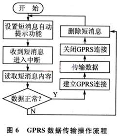 GPRS数据终端起着连接读写器设备与远程监控中心通信的作用,通过GPRS模块M33,远程监控主机可以随时了解读写器的状态。模块M33有两种状态,一种是短消息接收状态,另一种是自动监控状态。图6是M33处于短消息接收状态时GPRS数据传输的流程。