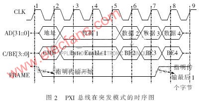本系统采用的是突发读写模式,图2为32位PXI总线在突发模式下的时序图。