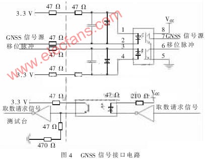 测量综合控制器测试台中,GNSS信号源模拟GNSS接收机。信号源的准确性有利于测量综合控制器性能的测量。测量综合控制器GNSS模块在每帧的开始利用帧同步脉冲向GNSS接收机发出取数请求信号,GNSS接收机接到请求后,在8 ms内向遥测设备传送完1 000 bit(125 B,先传高位)的测量参数后,遥测设备必须在下一个取数信号到来之前将数据传输完。其接口电路如图4所示。
