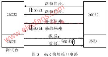 测量综合控制器测试台中SAR信号源模拟的是SAR压缩器,采用标准RS-422-A接口形式传输压缩后的图像数据(每字节8位的串行数据)。测量综合控制器每隔25 ms向测试系统发送取数请求信号,在取数请求由高变为低延迟一段时间后,测量综合控制器同时向测试台发送移位脉冲,测试台根据取数请求信号以及移位脉冲信号,向测量综合控制器发送相应的数据信息,其接口电路如图5所示。