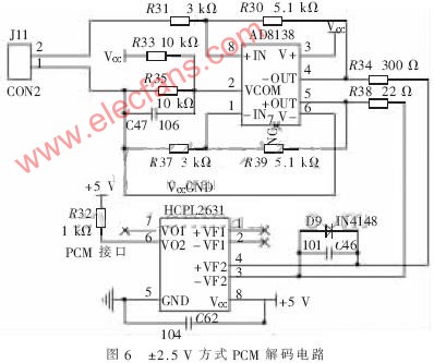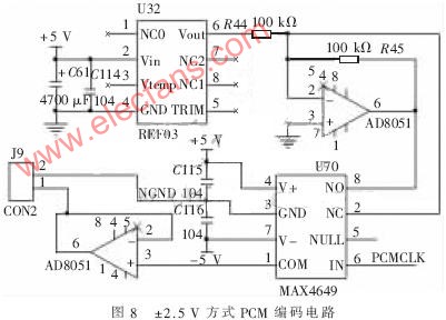 如图8所示为PCM编码电路,REF03通过调理电路输出2.5 V和-2.5 V电压。MAX4649是一个单刀双掷开关,FPGA控制PCMCLK信号来决定输出的PCM码流。