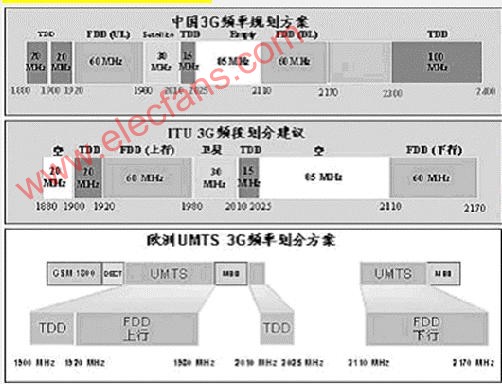 从使用的频段看,cdma2000多采用带内演进的方式实现,即多数运营商使用cdmaOne的800MHz频段,WCDMA多采用ITU规定的2GHz频段。在我国,信息产业部已经公布了3G的频率规划,可以看出,对于FDD和TDD方式都是首先启用2GHz频段。