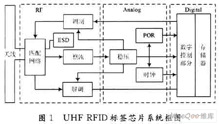 系统包括模拟射频前端和数字部分。模拟射频前端主要实现电源产生、调制/解调、时钟产生、上电复位等功能。数字控制部分控制着标签内部数据的流向,按照接收到的指令,控制标签进行状态转换、存储及返回所需要的内容,包括命令解析、数据编码、数据存储、读/写等功能。