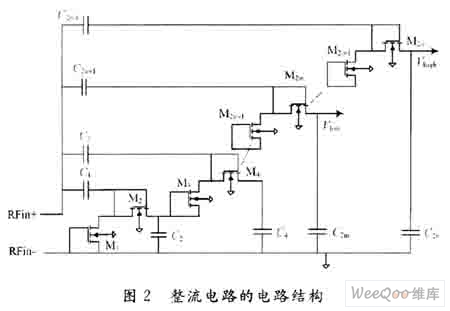 整流电路的功能主要是将天线感应的射频能量转化为供后级各模块使用的直流能量,整流电路的电路结构如图2所示。N级整流电路包含2N只整流二极管和2N只耦合电容,与输出相连的电容为储能电容。天线的两端RFin+和RFin-直接或者通过匹配网络连接到整流电路的输入端,通常RFin-端接地。下标为奇数的电容与下标为偶数的电容分别在输入电压的负半周期和正半周期进行充电、储能,从而产生直流电压,表达式为: