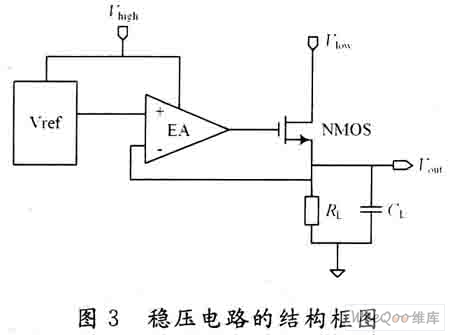 稳压电路的结构如图3所示。稳压电路的基本原理是将输出电压的和芯片内部的基准电压进行比较,比较的结果通过误差放大器放大,输入到调整管的栅极,改变调整管的栅源电压,调节其输出电流来跟踪负载,从而使低压差线性稳压器的输出电压稳定。