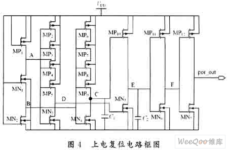 工作原理如下:随着电源电压VDD的升高,由于C1和反相器中4个长沟道PMOS的延迟作用,使得采样电路输出的低电压VB经过反相器得到的C点电压VC与电源电压VDD之间的压差大于晶体管MP10的阈值电压,且能为C2赢得足够的充电时间。当充电到电容C2上的电压VE大于整形电路第一个反相器中晶体管MN6的阈值电压时,晶体管MN6导通,输出电压VF翻转为低电平。再经过反相,在整形电路的输出端可以得到复位信号的上升沿。充电完成后,紧接着C2通过晶体管MN;放电,通常放电速度比充电速度更慢。当放电到C2上的电压小于晶体管MN6的阈值电压,晶体管MN6截止,输出电压VF翻转为高电平,此时在整形电路的输出端得到复位信号的下降沿。