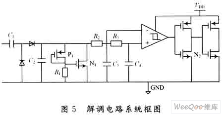 对于超高频RFID标签芯片的ASK解调电路,通常采用包络检波方式。解调电路的框图如图5所示。按照18000-6C/B标准,电路输入信号的包络频率范围为40~160 kHz,脉宽失真小于10%。包络检波器由一级Dickson电路和R2,C3组成的低通滤波器组成。产生的包络信号先送入比较器的负端,再通过低通滤波为比较器提供参考电压。比较器采用迟滞比较器,具有良好噪声抑制性能、高动态范围等特点。采用两级反相器目的是将输出电压进行整形,产生规则的方波信号。