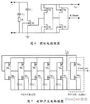 时钟产生电路采用环形振荡器电路,并加入电压和温度补偿电路,保证在不同的工作电压和温度下,频率偏移在规定的范围(±1%)内,电路框图如图7所示。电压补偿主要依靠一个电压基准电路产生一个基准电压源,提供给五级环形振荡器作为工作电压,这样就能保证在输入电压在O.9~1.1 V变化范围内,最大频偏能满足要求。环形振荡器的振荡频率呈正温度系数特性,故需加入一个负温度系数的补偿电路,并优化五级环形振荡器的有源器件的宽长比,使其温度系数恰与自身的温度系数互补,使时钟产生电路输出频率稳定。