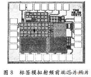 基于Cadence Spectre设计仿真平台和TSMC0.18μm CMOS混合信号工艺,对UHF RFID标签芯片模拟射频前端进行设计和仿真,并通过MPW项目流片实现。模拟射频前端芯片不含测试焊盘的核心电路的芯片面积为490μm×420μm,图8是芯片实物照片。