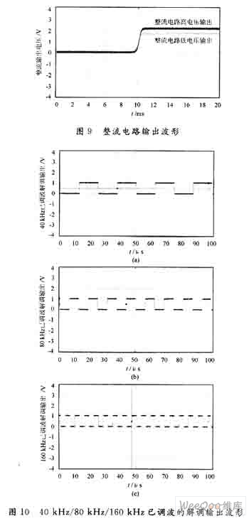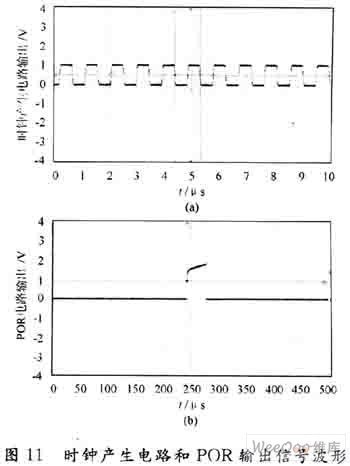 使用Agilent E4432B信号源对模拟射频前端进行激励,输入载频为915 MHz的ASK调制信号。图9为整流电路输出波形,并测得稳压电路高、低输出电压分别稳定在1.O V和1.8 V。图10解调电路的输出波形,可看出该电路能正确解调40~160 kHz的ASK调制信号。图11(a)是上电复位电路输出波形,脉冲宽度大于30μs。时钟产生电路输出如图11(b)所示,可看出波形近似方波且占空比约50%。使用AgilentN5230A矢量网络分析仪给芯片输入频率为915 MHz,功率-5 dBm的测试信号,测得“O”和“1”两种状态下标签反射系数相差12%。