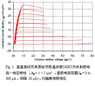 共基极模式开态击穿压(BVcbx)发生在集电极—基极电压为9 V,集电极电流为JC = 1.3 mA/µm²时。共发射极模式开态击穿(BVceo) 发生在集电极—发射极电压接近7V时。
