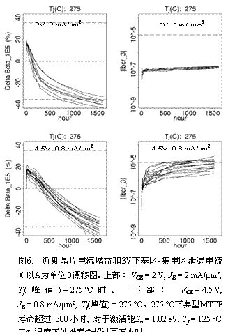 可靠性通过对分立的自对准1 × 3 µm² HBTs进行高温寿命测试(HTOL)来确定,电流增益(漂移是主要的可靠性失效模式。利用测试得到的激活能Ea, 其值大约为1.02 eV, 外推得到Tj = 125 °C.温度下MTTFs 寿命超过106 小时。电流增益(漂移和基区集电区电流泄漏(位列第二的主要可靠性失效模式)示于图。以电流增益漂移作为失效标准同样示于图,这一标准保证了值始终保持在以上。图的下半部显示双异质结双极晶体管结构(例如,InP集电区)可在VCE = 4.5 V 下保持高可靠性工作,这一电压值比InP衬底单异质结双极晶体管高出 2 3 V。