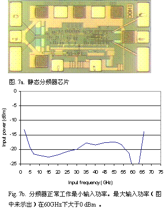 静态分频器性能和芯片照片示于图7。双极晶体管HBT 用作静电放电保护。 其输入灵敏度窗口非常宽,单端正弦波输入状态下一比二除法功能可在2GHz到60GHz范围内实现。输入和输出可采用差分和单端方式。90 mA时偏置电压为-3.4V。典型输出功率从低频时的. 0 dBm 到高频60GHz时的 3 dBm 。