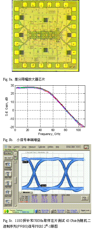 图8b 显示了典型的在片增益特性,低频S-E 增益26.8±0.5 dB , 3 dB 带宽46.8±0.4 GHz.。达到65 GHz时群