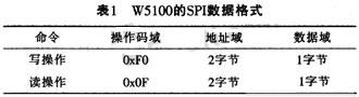 通过SPI接口来配置W5100的寄存器一般具有固定的命令格式。根据SPI协议,SPI设备之间只有两条数据线。因此需要定义操作码(OP_Code)。W5100使用两种操作码:读操作码和写操作码。除了这两种代码,它将忽略和不响应其它的操作码。在SPI模式下,W5100只对“完整的32位数据流”进行操作。这个32位的数据流包括1个字节的操作码、2个字节的地址码和1个字节的数据。其操作码、地址和数据字节的传输都是高位(MSB)在前、低位(LSB)在后。也就是说,SPI数据的第一位是操作码域的MSB,最后一位是数据域的LSB。W5100的SPI数据格式如表1所列。