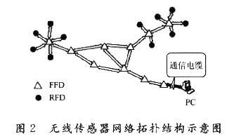 RFD(精简功能设备),这种设备不具有路由功能;另外还有一些节点负责与控制子节点通信、汇集数据和发布控制,或起到通信路由的作用,称为FFD(全功能设备或协调器)。如图2所示为一个典型的远程数据采集并返回到计算机终端的应用。每个节点由一个