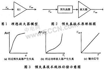 从原理上看,预失真线性化技术是改进线性特性的一项最简单的技术,其原理如图2所示,即在RF放大器的前面加入预失真器,预失真器的特性与RF放大器的特性精确匹配,当信号经过预失真器和RF放大器组成的级联系统时。由于预失真器与RF放大器的特性相互补偿效果,使得输出信号为完全无失真信号,从而达到线性化目的。这种补偿原理如图3所示,图3(a)与图3(b)曲线互相补偿,得到图3(c)完全无失真的输出信号。
