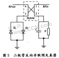 图5中,1和4分别是信号的输入端和输出端;2和3分别是信号的耦合端和直接输出端。两个反相并联的二极管D1,D2用来产生奇次谐波分量,经90°正交电桥的隔离端4输出,作为预失真信号。理想的3 dB正交电桥耦合端2接电阻R,用来消除二极管相对反射输出信号中残留的线性分量,而电容C用来降低载波信号,使之与预失真信号相比不至于过高。
