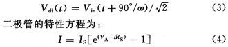式(4)中:IS为反向饱和电流,主要受温度的影响,在电路中可视为恒定值;VA为二极管外加偏置电压,这里VA=Vdi(t)。在小偏置电流下可忽略式(4)中附加项IRS。输入电流i(t)为:![]()