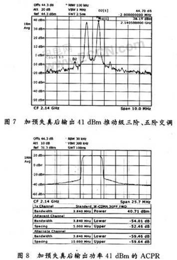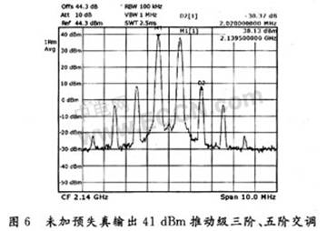从频谱分析仪的输出波形图可以看到,在加预失真系统前,推动级输出41 dBm时的三阶交调分量,五阶交调分量的指标分别为-31 dB和-40 dB。对应地,当把预失真发生器接人系统后,可以看到输出的五阶交调分量,五阶交调分量均有了明显的改善,分别提高了14 dB和11 dB。此时,输出级ACPR的输出小于-52 dB。实验结果表明,该预失真系统在很大程度上改善了功率放大器的非线性失真,很好地优化了它的线性度。