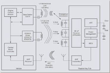当用户拉动汽车门柄时,车辆中的天线驱动器便会产生LF场。这种变化激活中央仪表板的控制器,请求密钥卡启动LF通信。通常每扇车门内都安装有LF天线线圈,由天线驱动器单元驱动 (一个天线驱动器单元可以驱动多个天线线圈,比如,ATA5279就能够驱动多达6个不同的天线线圈)。系统采用一个UHF接收器模块来接收从密钥卡发出的RF数据,以支持RF链路。接收到的数据经加密后再被发送回仪表板控制器,然后通过软件进行解密(AES-128)。
