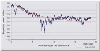 如果接地噪声反射可以忽略,按照自由空间方程,可计算出距离大约为3km。然而本例考虑到了接地噪声反射,典型可接收距离降至300m。当然,实际中接地噪声反射远比本例的更为复杂。图7显示了反射效应是如何影响车辆天线的接收功率的。红色曲线代表自由空间条件下的理想情况,而蓝色曲线代表有人慢慢走近汽车时的行为。