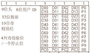 数据结构如图2所示,以连续9位“1”作为数据头,是读取数据时的同步标识;D00~D93位是用户定义数据位;P0~P9是行奇偶校验位,PC0~PC3是列奇偶校验位,最后以“0”作为结束标志,这种数据结构有效的保证了数据传输的正确性。