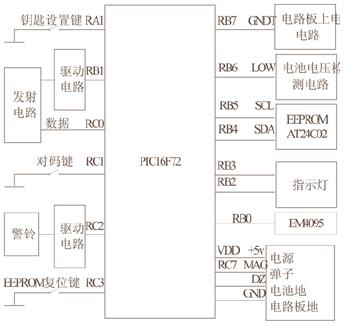 控制电路由上电保持电路,电压检测电路,无线发射电路和Microchip公司的单片机PIC16F72等组成(见图4)。