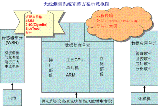 传感器部分就是WSN---无线传感器,可以根据现场需求进行选择使用;而数据应用部分实际上就是软件系统,可根据应用的需要进行分类设计;核心的部分是数据处理单元,可根据应用需要选择单片机或ARM系统。