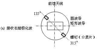 45°介质片分量移相器如图3-18所示。在圆波导内与矩形波导宽边45°角方向上安装一个介质片。假设进入馈源的来波是左旋圆极化波,则可将圆极化波分解为与介质片平行的分量 图3-19表示在圆波导内放置两排销钉,构成销钉分量移相器。对于行于销钉所在平面的电场 接收各种极化波时,极化器与波导宽边的安置方向如图3-20所示,这是从高频头的矩形波导口向馈源方向看去的。 圆形波导由于结构对称,对波的极化形式没有选择,而矩形波导只允许与其宽边垂直的电场通过,所以波导的宽边必须与电波极化的方向相垂直。