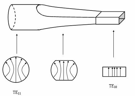 图 3-22 圆矩渐变过渡波导及其电场模式变换过程示意图 阶梯式矩圆过渡波导如图3-24所示。采用几节长度为λg/4 阶梯,使圆波导过渡到矩形波导,λg为其节变形波导段的波导波长。一般采用2节λg/4过渡段,每一台阶的高度由λg/4 过渡段的特性阻抗决定。