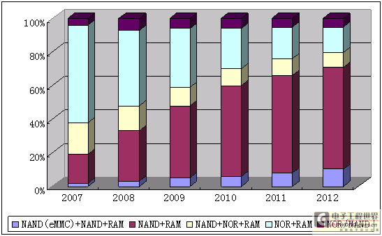 目前智能手机100%使用NAND+RAM型内存配置,大约60%的高端手机也采用NAND+RAM型内存配置.中低端手机一般采用NOR+RAM型内存配置,超低端手机大部分采用单NOR型内存配置.