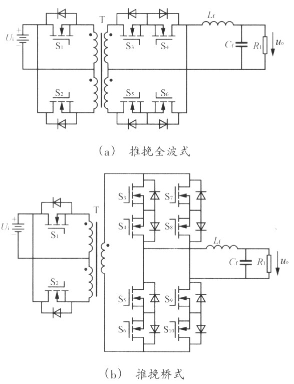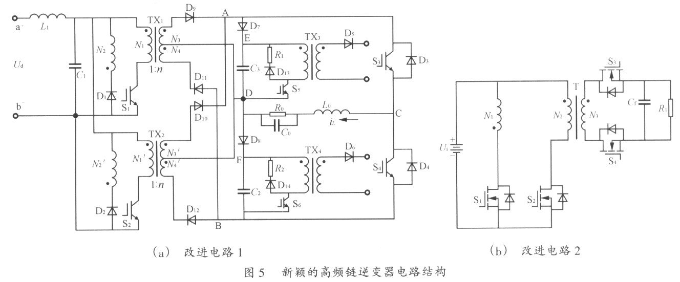 针对磁芯饱和问题,提出了一些新的电路拓扑,现简单介绍两个改进的电路,如图5所示。图5(a)中变压器原边的两个正激变换器将高频单极性SPWM脉冲序列分成两组驱动脉冲,这两个正激变换器是由这两组SPWM驱动脉冲分别控制的,因此最大的工作占空比可以大于0.5,不存在磁芯饱和的问题,且具有较低的电压应力。而副边两个主开关管是由与输出频率相同的低频方波控