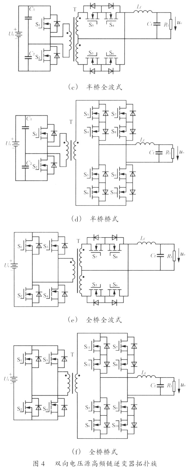 双向电压源高频链逆变拓扑族如图4所示,从输入侧逆变级看,推挽式电路适用于低压输入变换场合;半桥和全桥电路适用于高压输入场合。从输出侧周波变换级看,全波式电路功率开关电压应力高,功率开关数少,变压器绕组利用率低,适用于低压输出变换场合;全桥式电路功率开关电压应力低,功率开关数多,变压器绕组的利用率高,适用于高压输出场合。