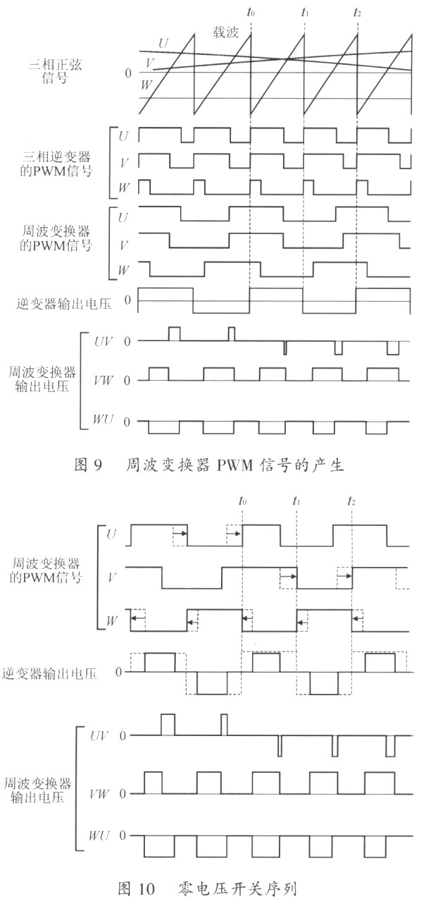 图10中的虚线是图9中的PWM信号和逆变器输出电压信号,但只有在周波变换器输出的最大宽度电压内才要求逆变器必须输出电压,在半个开关周期内的其他时间逆变器的输出都为O,因此,周波变换器PWM信号的边界可以移到逆变器输出为0的区域,如图10所示,开关器件都是在零电压期间进行开通和关断。