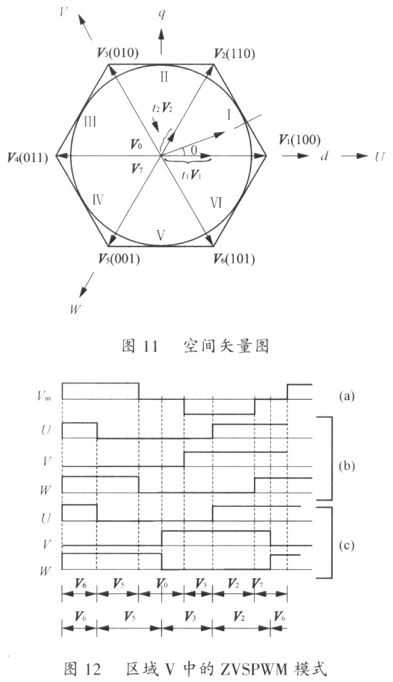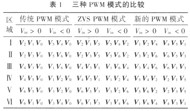 图11为空间矢量图,它是由6个向量(V1~V6)和两个零向量(V0和V7)构成的,分成6个区间。图12是当周波变换器输入电压为(a)时,传统PWM(b)和非谐振ZVS PWM(c)两种模式在区域V中的波形图。由于上述非谐振ZVS只能在从一个开关周期到另一个开关周期变换时实现软开关,因此义提出了一种新的控制方案,不仅在周期变换时而且在周期内都能实现软开关。表1列出了3种PWM模式的比较。