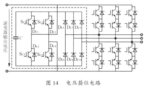 在有开关器件的电路中,往往通过增加缓冲电路来防止开关器件出现过电压,但在缓冲电路中会产生大量功率损耗,而图14中虚线部分组成的电压箝位电路就可以解决此问题。电压箝位电路包括一个电容、4个开关管和10个二极管。在周波变换器换相的时候,电容吸收储存在变压器漏感上的能量,这就可以避免开关器件发生电压过冲,而且为了降低功率损耗,储存在电容上的能量还可以通过4个开关管反馈回逆变器端或负载端。在周波变换器死区时间内负载电流可以通过二极管DC5-DC10导通,而且还可以当负载过流时快速切断负载,而不会形成过压导致周波变换器中的开关管击穿。