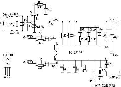 为使电路尽量简单而不增加太多成本,电子开关是由场效应管VT担任。因为场效应管所需驱动功率极小,基本不要驱动电流。由磁棒线圈L吸收开电视机而产生在电视机周围的电磁场的能量,经D1、D2倍压整流,在电容C上积累一定电量,当电压逐步提高到场效应管VT的开启电压(约2V以上),场效应管导通?V电源通过限流电阻R、VT为转播系统供电。本系统使用1.5V电压,所以用红发光二极管LED作为稳压管,又可兼作工作指示灯。