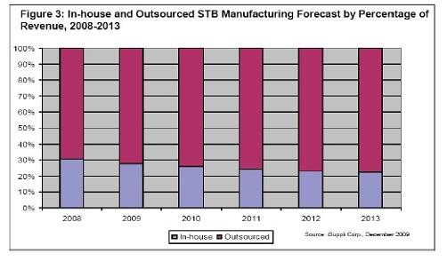 iSuppli 公司对于内部及外部制造的机顶盒营业收入百分比情况的预测