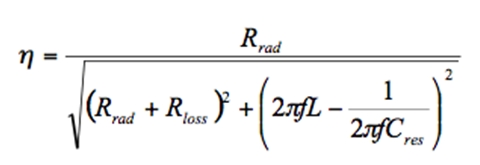 非谐振频率点的天线效率η要低于最大效率ηres,因为此时的天线输入阻抗Zant要么是容性的,要么是感性的。