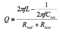 Q是指品质因数,正比于单位时间内天线网络中存储的能量与损耗或幅射能量的比值。针对带天线谐振网络的上述天线等效电路而言,Q值满足: