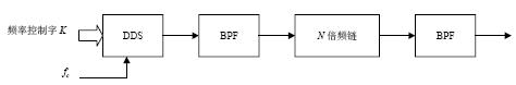 DDS与DS相结合,利用模拟倍频器替代PLL,克服了DDS+PLL频率合成器的频率转换时间长的弱点。在该方案里,用DDS作为频率合成器核心部件,产生足够多离散频点,然后利用多个倍频器和滤波器组成的倍频链提高DDS输出频率,同时拓展了DDS输出带宽。系统方案原理如图3所示。图中插入带通滤波器抑制带外的杂散,提高了频谱纯度。