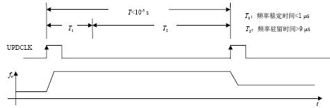 频率合成器的跳频速率是105 跳/s,平均每一跳的时长T为10 μs,它由频率稳定时间T1和频率驻留时间T2两部分时间组成。在T1时间内完成本次频率的跳变,在T2时间内完成下一跳的频率调节字寄存器的数据的写入。频率跳变示意图如图5所示。