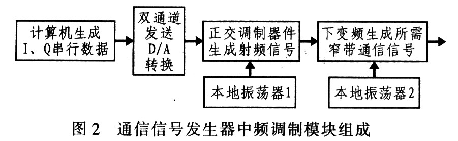 根据图2的中频调制模块结构图,在通用通信信号发生器中频调制模块中,双通道D/A转换器与正交调制器共同生成射频信号。在设计中,正交调制器AD8346与双通道D/A转换器AD976l相配合能满足正交调制的设计需求。
