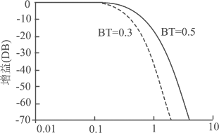 相邻码元之间的相互影响程度和高斯滤波器的参数有关,也就是说和高斯滤波器的3dB带宽B有关。通常将高斯滤波器的3dB带宽B和输入码元宽度T的乘积BT值作为设计高斯滤波器的一个主要参数。BT值越小,相邻码元之间的相互影响越大。理论分析和计算机模拟结果表明 。BT值越小,GMSK信号功率频谱密度的高额分量衰减越快。主瓣越小,信号所占用的频带越窄,带外能量的辐射越小,邻道干扰也越小。