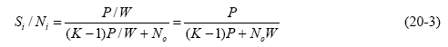 假定系统中有K个通信用户,分别用不同的PN码来调制信息数据。假设理想功率控制(功率控制的内容在后续章节中详细讲述,这里只需要明白各个用户到达接收端的功率相同)的情况,设P是接收的每一个用户的信号功率,系统的扩频带宽为W,噪声的功率谱密度用 表示,则接收端接收到的有用信号功率谱为P/W,接收到的其它用户的干扰功率谱为(K-1)P/W,那么该通信用户的输入信噪比等于: